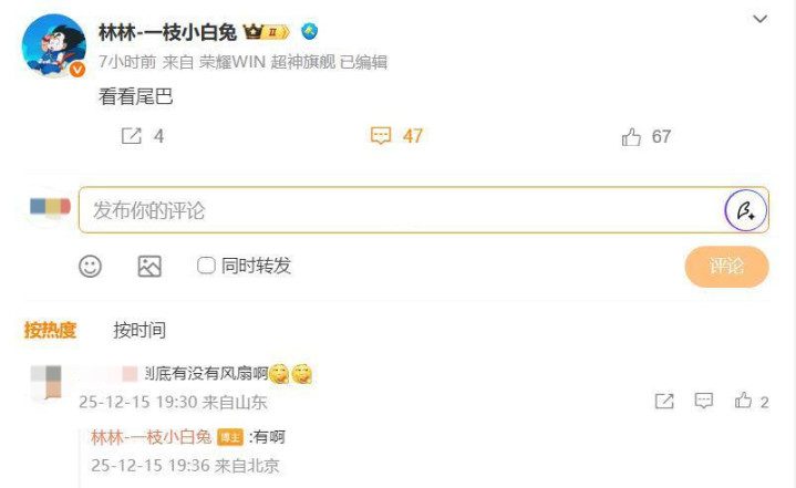 继荣耀中国区电商部部长 @荣耀鹏哥 在转发的一条AG电竞俱乐部发布的队员一诺的日常花絮照片暗示,其手中就是荣耀WIN系列的真机之后, @荣耀手机 官博也确认了该系列新机的消息。日前,荣耀中国区智慧生活业务部部长 @林林-一枝小白兔 直接晒出了该机的微博尾巴,并确认,该系列新机确实有风扇配置。